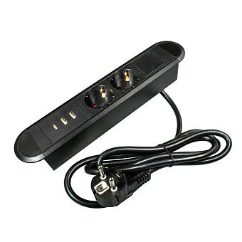 Блок розеток встр. OPTIMA 12А, выкл., 2 пост, черн., 2USB, 1Type-C, провод 1,8м