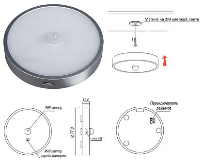Светильник аккум. (LED) CENTALIUS, с датч. движ, 0,8Вт, 4000K, 50Лм, 1020мА/ч, серебр., магнит