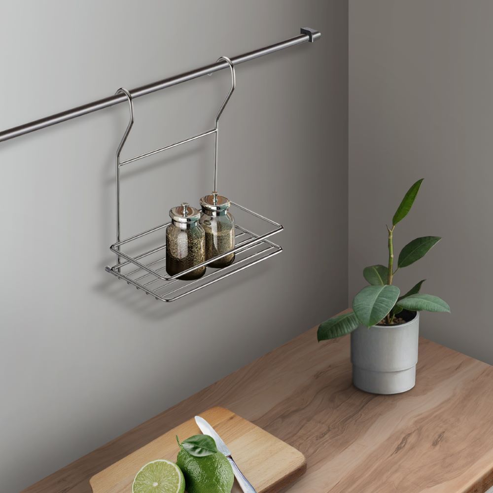 Полка позволяет использовать пространство на стене, освобождая рабочую поверхность. Полка небольшого размера, для самых нужных мелочей. Полка выполнена из нержавеющей стали. Легко и надежно вешается на трубу рейлинга.