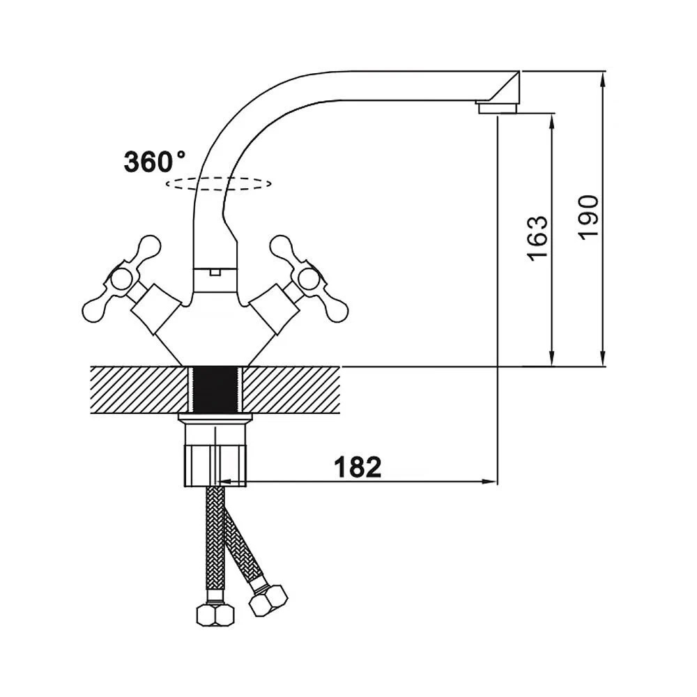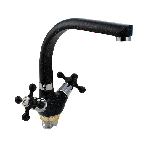 Смеситель для кухонной мойки и раковин, корпус комбинированный, чёрная матовая эмаль с вкраплениями и с хромом, с высоким Г-образным изливом. Крепление резьба-гайка. Кранбукса м/к, ручка крест, поворот на 90. Аэратор для экономии воды. Габаритные размеры: высота 190 мм, длина 200 мм, диаметр посадочного седла 45 мм, длина резьбы 30 мм, длина подводки 400 мм, вес - 1,150 кг, объём - 0,00327 м3. В комплекте паспорт, корпус с изливом, подводка 1/2, крепеж, набор прокладок.