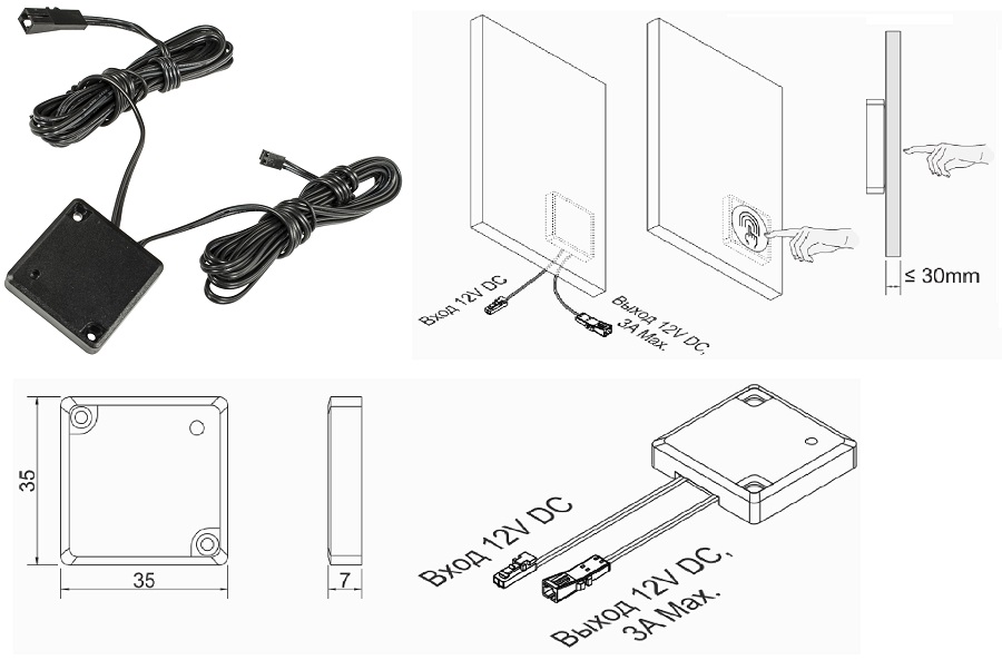Выключатель сенсорный CSS-2 служит для включения-выключения светодиодных светильников 12В мощностью до 36Вт. Выключатель устанавливается на скрытую поверхность из диэлектрических материалов (ДСП, ДВП, оргстекло и т.п.), например, кухонных столешниц, декоративного/защитного фартука на кухне, стенку шкафа-купе и т.д. Место касания на видимой стороне поверхности, с обратной стороны которой установлен CSS-2, отмечается значком - стикером, обозначающим место контактной площадки сенсорного выключателя, коснувшись которой Вы сможете управлять включением / выключением света.